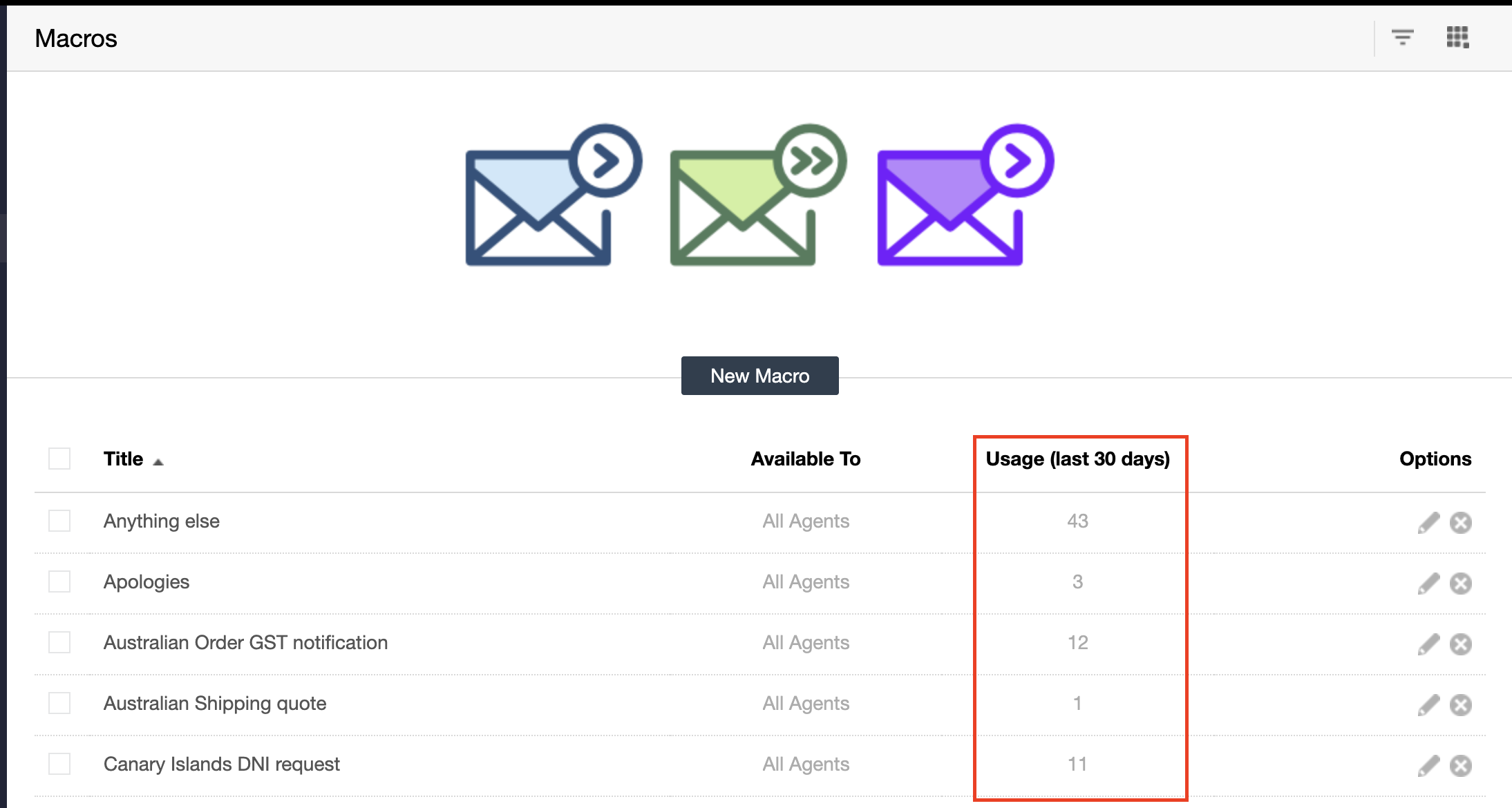 Added a usage metric showing how often a macro or canned response was used over the last 30 days.