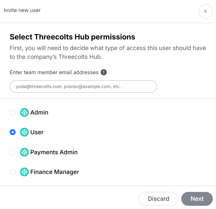- Enter the new user's email, and select the type of access this user should have to the company's Threecolts Hub.