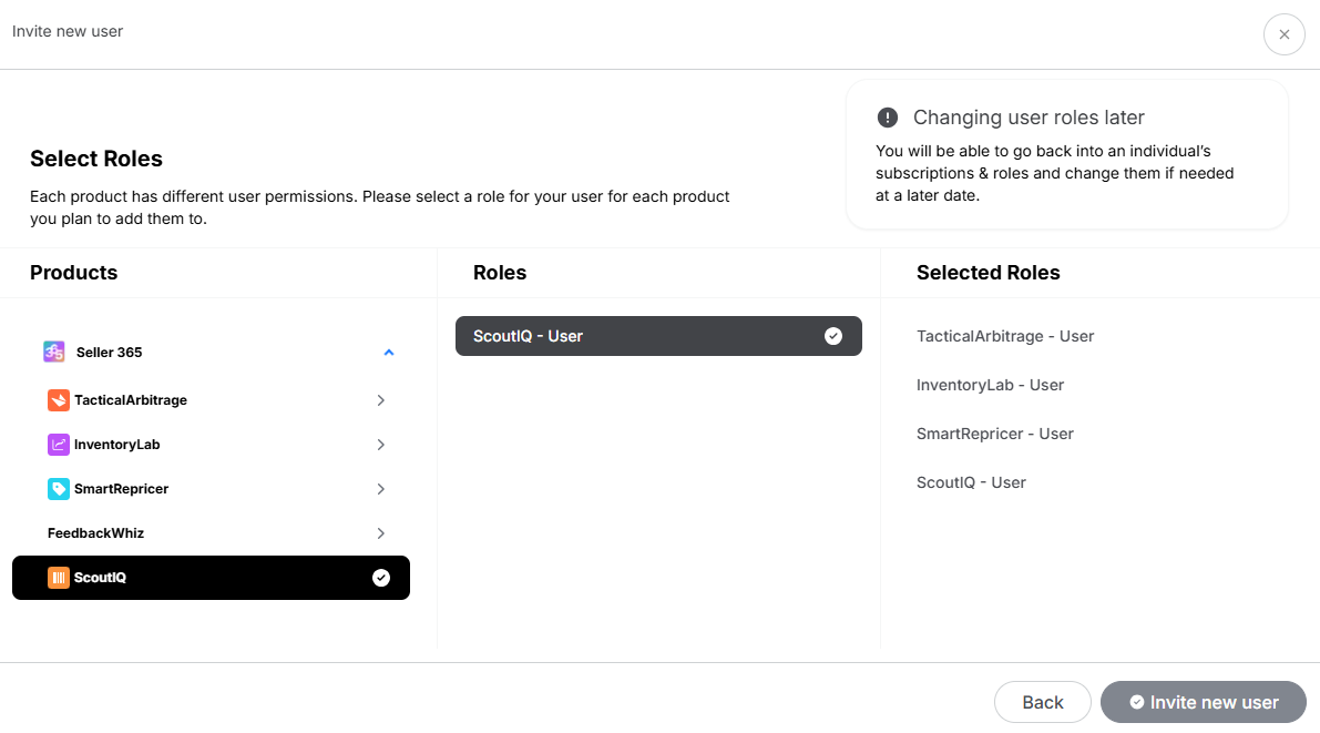 - Assign roles for each product by selecting the product, and then choosing the role. Repeat this step for each product the user should have access to.