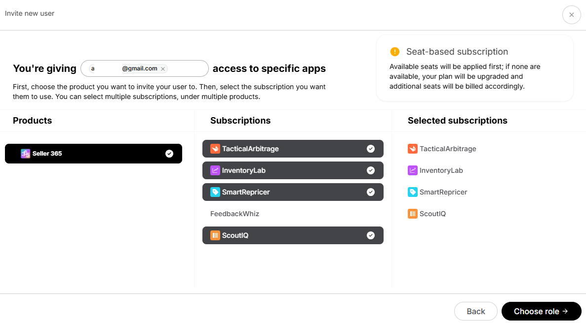- Choose the product you want to invite the user to (if you have more than one), then select the subscription you want them to use.